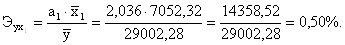 если фактор х1 увеличить на 1%, то результат y увеличится на 50%. Аналогично находим коэффициент эластичности для фактора х3 :