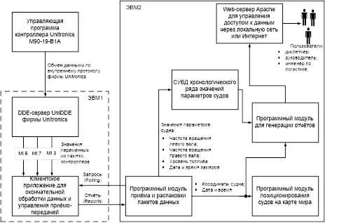 Рисунок 2.13 - Окно сервера UniDDE со списком отображаемых переменных Теперь сервер готов к использованию. Для начала работы необходимо запустить сервер нажатием на кнопку «Run». 2.6 Разработка клиентского приложения Клиентское приложение устанавливается на ПЭВМ капитана судна и производит приём и обработку информации, поступающей от контроллера. Оно содержит также модуль для работы с терминалом спутниковой системы Inmarsat. Вид главного окна приложения приведён на рисунке 2.14.