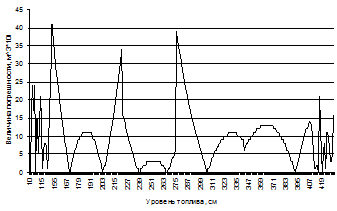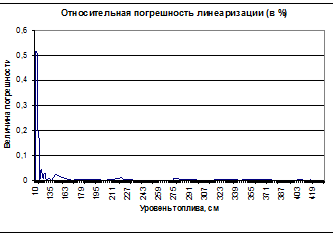 Как видно из таблицы, наибольшая погрешность аппроксимации существует на первом участке. По графику видно, что на данном участке кривая существенно не линейна. Это и объясняет такое значение погрешности. Однако этот факт не является существенным недостатком, поскольку данный участок достаточно мал и соответствует довольно низким уровням топлива, которые редко достигаются на практике. На рисунке 2.4 показана расчётная градуировочная характеристика, полученная при помощи описанных выше уравнений.