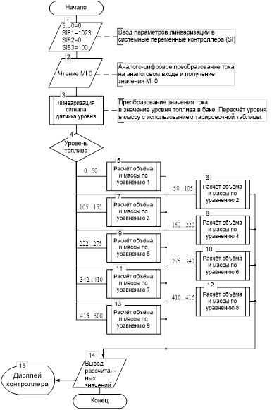 Рисунок 2.7 - Фрагмент программы, выполняющий линеаризацию Вычисление объёма и массы топлива по его уровню. Производится с помощью совокупности линейных уравнений, описанных выше. После получения значения уровня производится выбор соответствующего уравнения. На рисунке 2.8 показан фрагмент программы, в котором производится вычисление объёма топлива в цистерне .