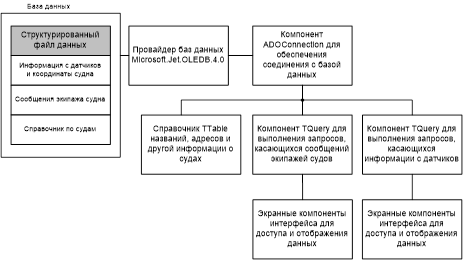 Рисунок 2.17 - Окно приложения с информацией от датчиков судна 2.8 Организация взаимодействия с базой данных Для организации доступа к базе данных используется встроенный в операционную систему Windows провайдер баз данных Microsoft.Jet.OLEDB.4.0. Такой подход позволяет отказаться от дополнительного приобретения СУБД других производителей, что в свою очередь снижает себестоимость и размер рассматриваемого пакета программ. Для организации доступа к данным построена цепочка посредников, схема которой показана на рисунке 2.18.