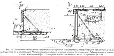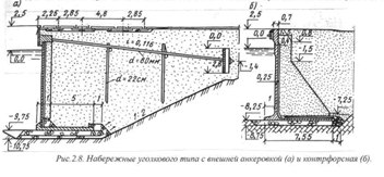 УГОЛКОВЫЕ НАБЕРЕЖНЫЕ С ВНЕШНЕЙ АНКЕРОВКОЙ. Отличаются тем, что их лицевые плиты анкеруются не к фундаменту, а к специальным анкерным плитам. Этот прием позволил снизить напряжения в основании причальной стенки.