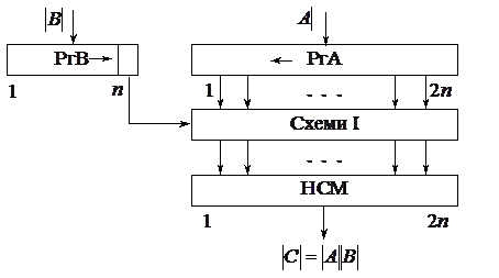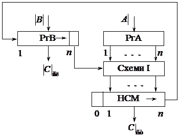 Таблиця 3.3 - Приклад множення за методом 2 У кожному циклі до суми часткових добутків Для реалізації даного методу множення потрібні (рис.3.3) п -розрядний регістр множеного РгА, п -розрядний регістр множника РгВ з колами для зсуву вліво, п схем І і (2п +1)-розрядний нагромаджувальний суматор НСМ з колами для зсуву вправо. Тут множене завжди додається до п старших розрядів суми часткових добутків. Один додатковий розряд ліворуч у НСМ необхідний для запам'ятовування цифри переповнення, що може виникнути в процесі додавання; під час наступного зсуву ця цифра піде в старший з основних розрядів нагромаджувального суматора, так що в остаточному результаті переповнення не буде.