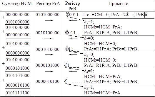 Приклад 3.4. Помножити числа А = 0, 11100 і В = 0, 10011, використовуючи метод 3. Розв'язання