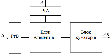 Рис. 3.5. Структурна схема пристрою, що реалізує множення за методом 4 Приклад 3.6. Помножити числа А = 0, 10100 і В = 0, 10011, використовуючи метод 4. Розв'язання