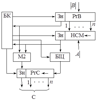 Рис. 3.3. Структурна схема пристрою, що реалізує множення за методом 3 Оскільки в кожному циклі в нагромаджувальному суматорі НСМ спочатку виконується додавання, а потім зсув коду, то час множення п -розрядних кодів за даним методом дорівнює: