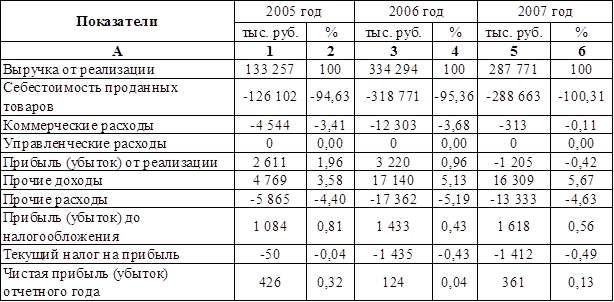 Все показатели отчета о прибылях и убытках при проведении структурного анализа приводятся в процентах к объему выручки от реализации (таблица 3.2). Таблица 3.2 - Вертикальный анализ отчета о прибылях и убытках ООО «ФИНИСТ-МЫЛОВАР» за 2005-2007 г.г., %