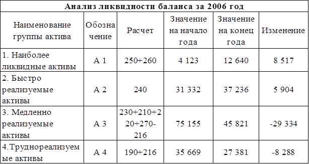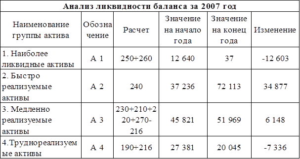Используя данные таблицы 2 видно, что в выручке от реализации 2005 года полная себестоимость составила 94,63%, в 2006 году затраты составляли 95,36 %, а в 2007 году затраты увеличились до 100,31 % и предприятие получило убыток от основной деятельности. Следовательно, прибыль от реализации в 2005 году составила 1,96 %, в 2006г. – 0,96%, а в 2007 убыток составил -1205 тыс. руб. С учетом результатов от прочей деятельности и выплаты налога на прибыль чистая прибыль в 2005 году составила 0,32% в выручке. В 2006 году чистая прибыль сократилась на 0,28 пункта. Предпринимательская деятельность все больше зависит от экономической информации. При этом большее значение придается полноте, достоверности и нейтральности информации о финансовых результатах и условиях их возникновения. Самым распространенным источником такой информации является бухгалтерская (финансовая) отчетность. Необходимость составления бухгалтерской отчетности порождается принципом непрерывности деятельности организации, закрепленным в пункте 6 ПБУ 1/98 «Учетная политика организации». Согласно этому принципу, организация будет продолжать функционировать в обозримом будущем. Поэтому для целей анализа, контроля, налогооблажения, а также для принятия управленческих решений необходимо периодически иметь сводные данные об имущественном положении организации и финансовых результатах ее деятельности. Все это приводит к необходимости составления бухгалтерской отчетности, важной частью которой являются показатели финансовых результатов. Из всех форм бухгалтерской отчетности важнейшей является баланс. Данные баланса необходимы: собственникам - для контроля над вложенным капиталом, руководству организации - при анализе и планировании, банкам и другим кредиторам - для оценки финансовой устойчивости. Бухгалтерский баланс состоит из двух равновеликих частей: актива и пассива. Бухгалтерский баланс характеризует в денежной форме финансовое положение предприятия по состоянию на отчетную дату. По балансу характеризуется состояние материальных запасов, расчетов, наличие денежных средств, инвестиций. Анализ ликвидности баланса заключается в сравнении средств по активу, сгруппированных по степени ликвидности и расположенных в порядке убывания ликвидности, с обязательством по пассиву, сгруппированными по срокам их погашения и расположенными в порядке возрастания сроков. В зависимости от степени ликвидности, т.е. скорости превращения в денежные средства, активы предприятия разделяются на следующие группы: А1. наиболее ликвидные активы - к ним относятся все статьи денежных средств предприятия и краткосрочные финансовые вложения (ценные бумаги). А2. Быстро реализуемые активы - дебиторская задолженность, платежи по которой ожидаются в течение 12 месяцев после отчетной даты. A3. Медленно реализуемые активы - статьи раздела 2 актива баланса, включающие запасы, налог на добавленную стоимость, дебиторскую задолженность (платежи по которой ожидаются более чем через 12 месяцев после отчетной даты) и прочие оборотные активы. А4. Трудно реализуемые активы - статьи 1 актива баланса - внеоборотные активы. Пассивы баланса группируются по степени срочности их оплаты: П1. Наиболее срочные обязательства - к ним относится кредиторская задолженность. ГО. Краткосрочные пассивы - это краткосрочные заемные средства, задолжен