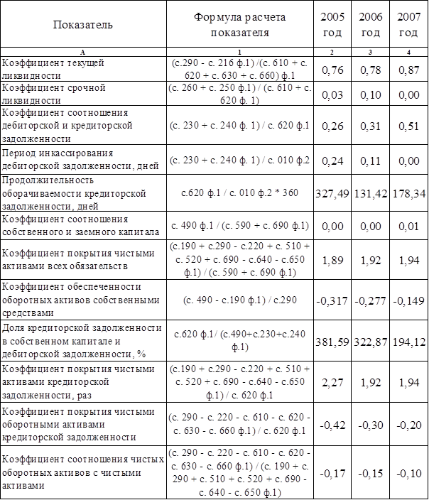 По данным расчета в таблице 3.6 видно, что с 2005 по 2007 годы выполняется первое неравенство, следовательно ООО «ФИНИСТ-МЫЛОВАР» имеет абсолютную финансовую устойчивость период. Однако в целом финансовая устойчивость предприятия на настолько стабильна. Предприятие не может быть признано финансово устойчивым поскольку имеет огромную кредиторскую задолженность, в основном перед своими поставщиками и своими средствами не покрывает общую сумму займов и кредиторской задолженности. Можно предположить, что в принципе финансовое состояние данной организации позволяет быть уверенным в своевременном выполнении обязательств в соответствии с договорами на протяжении многих лет функционирования. Следовательно, ООО «ФИНИСТ-МЫЛОВАР» имеет рациональную структуру имущества и его источников для своего вида деятельности. Платежеспособность предприятия - это способность своевременно и в полном объеме погашать свои финансовые обязательства. Ликвидность - это способность отдельных видов имущественных ценностей обращаться в денежную форму без потерь своей балансовой стоимости. Понятия платежеспособности и ликвидности близки по содержанию, но не идентичны. При достаточно высоком уровне платежеспособности предприятия его финансовое положение характеризуется как устойчивое. В то же время высокий уровень платежеспособности не всегда подтверждает выгодность вложений средств в оборотные активы, в частности, излишний запас товарно-материальных ценностей, затоваривание готовой продукцией, наличие безнадежной дебиторской задолженности снижают уровень ликвидности оборотных активов. Устойчивое финансовое положение предприятия является важнейшим фактором его застрахованности от возможного банкротства. С этих позиций важно знать, насколько платежеспособно предприятие и какова степень ликвидности его активов. Ликвидность активов представляет собой их возможность при определенных обстоятельствах обратиться в денежную форму (наличность) для возмещения обязательств. Из всех активов организации наиболее ликвидными являются оборотные активы, а из всех оборотных активов абсолютно ликвидные денежные средства, краткосрочные финансовые вложения (ценные бумаги, депозиты и т.п.), а также непросроченная дебиторская задолженность, срок оплаты которой наступил, или счета, акцептованные к оплате. Другую часть оборотных активов нельзя с большой уверенностью назвать высоколиквидными активами (например, запасы, просроченная дебиторская задолженность, задолженность по выданным авансам и средствам в подотчет). Тем не менее при определенных условиях и грaмотных методах работы с дебиторами-клиентами эта задолженность все-таки будет возвращена, а запасы реализованы. Однако следует иметь в виду, что отдельные виды внеоборотных активов (транспорт, здания, современное оборудование, компьютеры и т.п.) также можно при необходимости реализовать даже с большим успехом, чем, например, некоторые запасы, и получить искомую наличность, если это в интересах организации. Коэффициенты платежеспособности и ликвидности отражают способность предприятия погасить свои краткосрочные обязательства легкореализуемыми средствами. Высокое значение данных коэффициентов свидетельствует об устойчивом финансовом положении предприятия, низкое их значение - о в