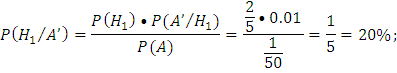Ответ: Вероятность попадания на сборку небракованной детали равна 98%. Задача 3. В сборочный цех завода поступают детали с трех автоматов. Первый автомат дает 1% брака, второй – 2%, третий – 3%. С каждого автомата поступило на сборку соответственно 20, 10, 20 деталей. Взятая на сборку деталь оказалась бракованной. Найти вероятность того, что деталь поступила с 1-го автомата. Решение. По формуле полной вероятности: