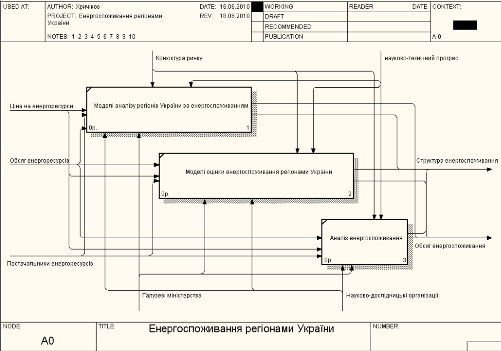 Рис. 2.1. IDEF модель аналізу енергоспоживання регіонами України Кон’юктура виступає як динамічний прогрес економічних змін, що характеризується напрямом і мірою варіативної певної сукупності елементів народного господарства. Вона є постійно змінюючимся динамічним процесом. Її роль є дуже значною, бо саме вона впливає на роботу підприємств, що характеризують регіон. Варто зауважити, що зараз існує проблема енергозбереження, яка робить науково –технічний прогрес рушійною ланкою для її вирішення. Нові розробки та дослідження дають змогу підприємствам оптимізувати затрати. Для забезпечення використання потенціалу енергозбереження, перш за все, необхідні удосконалення нормативно-правової бази і державної політики у сфері енергозбереження, яка б спонукала енергоспоживачів до належного обліку ощадного використання. Галузеві міністерства та науково-дослідницькі центри, зазначені на рис. 2.2., сприяють впровадженню інноваційних технологій, допомагають створити необхідну базу для поліпшення умов праці. Важливість подібних установ проявляється в працях, розроблених працівниками, та співробітництві з підприємствами не тільки в місцевій сфері діяльності інших регіонів.