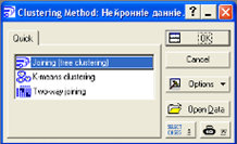 Рис. 3.10. Вибір метода кластеризації Основна ідея полягає в тому, що на кожній ітерації перерозраховується центр мас для кожного кластера, отриманого на попередньому кроці, потім вектори розбиваються на кластери знову відповідно до того, який з нових центрів виявився ближче по выбраной метриці. Алгоритм завершується, коли на якійсь ітерації не відбувається зміни кластерів.