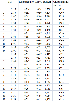 Рис.3.1.Дані необхідні для розрахунків Вказані змінні є показниками витрат енергоресурсів регіонами України зазначні у одиницях виміру toe, а саме: Х1 – обсяги споживання природнього газу; Х2 - обсяги споживання електроенергії; Х3 - обсяги споживання нафти та нафтопродуктів; Х4 - обсяги споживання вугілля; Х5 - обсяги споживання альтернативних джерел енергії. При визначенні пріоритетних напрямів комплексного енергоспоживання регіону кластерний аналіз може використовуватися в декількох аспектах. Перша сфера застосування - це виявлення проблем, формування переліку регіонів з високими показниками споживання ресурсів, наявності великих родовищ, заводів, які визначають загальні витрати енергоресурсів. Другим аспектом аналізу є оцінка потенціалу і відбір регіонів, які можуть стати лідерами в ефективному енергоспоживанні, на основі вивчення розподілу ресурсів, виробничих потужностей. Для більш повного аналізу регіонального споживання енергоресурсів необхідно використати декілька методів кластеризації починаючи з побудови дерева зазначеної на рис. 3.2.:
