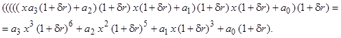 каждой двуместной арифметической операции умножать на множитель P:=0; j:=3; repeat S:=a[j]*x+a [j-1]; P:=P+S*x; j:=j-1; until j=1; функция алгоритма будет: