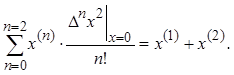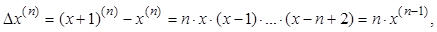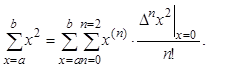 2.4 Исчисление конечных разностей Разложение функций в ряд по факториальным многочленам (интерполяционным многочленам Ньютона в частности) дает возможность получать формулы суммирования функциональных рядов в виде аналитических выражений, зависящих от пределов. Эта возможность открывается в связи с тем, что суммировать конечные разности не представляет большой сложности, а выразить конечную разность от факториального многочлена через факториальный же многочлен можно, воспользовавшись соотношением: