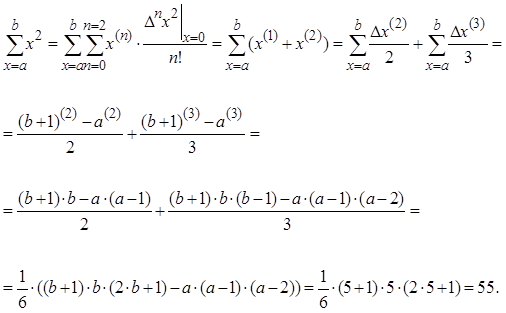 Если распределить вычисление сумм по слагаемым, то мы перейдем к суммированию конечных разностей от факториальных многочленов: