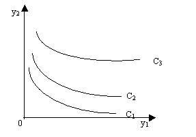 где Y В совокупности потребительских благ каждому уравнению U(Y) = С соответствует определенная поверхность равноценных, или безразличных, наборов благ, которая называется поверхностью безразличия. Для наглядности рассмотрим пространство двух благ, например, в виде двух агрегированных групп товаров: продукты питания (y1 ) и непродовольственные товары, включая услуги (у2 ). Тогда уровни целевой функции потребления можно изобразить на плоскости в виде кривых безразличия, соответствующих различным значениям С (рис. 8.1, где С1 < С2 < Сз).