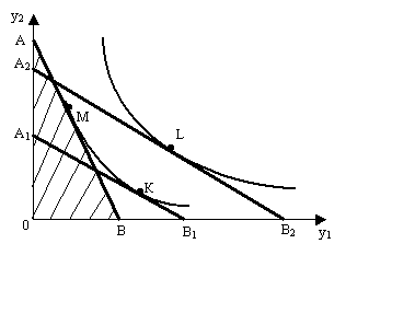 Рис. 8.2. График простейшей модели поведения потребителя Набор товаров М, соответствующий точке касания прямой АВ с наиболее отдаленной кривой безразличия, является оптимальным решением (в других вариантах это точки К и L). Легко заметить, что линии АВ и A1 B1 соответствуют одному и тому же размеру дохода и разным ценам на товары y1 и у2 ; линия A2 B2 соответствует большему размеру дохода. На основе теории нелинейного программирования, можно определить математические условия оптимальности решений для модели (8.1). С задачей нелинейного программирования связывается так называемая функция Лагранжа, которая для задачи (8.1) имеет вид L(Y, l,) = U(Y) + l(D - PY), где множитель Лагранжа l является оптимальной оценкой дохода. Обозначим частные производные функции U(Y)