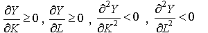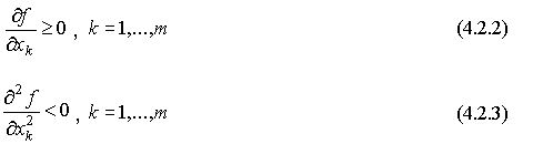 Вопрос об адекватном описании экономической реальности на языке производственных функций тесно связан с их математическими свойствами. Ради простоты эти свойства приведем для однопродуктового производства, т.е. для производственной функции вида (4.2.1) . 1. Монотонность: из 2. Вогнутость: для любых 3. Поведение в начале координат: 4. Однородность: Если производственная функция дифференцируема по всем аргументам, то свойства 1 и 2 соответственно могут быть заменены следующими неравенствами: