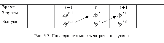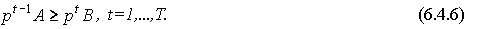 В модели Неймана предполагается неприбыльность базисных процессов. Это объясняется тем, что издержки и выручки разведены во времени, т.е. относятся к разным моментам времени, и в условиях расширяющейся экономики "характерен случай падения цен ( Основной предмет исследования Дж. фон Неймана - это возможность существования равновесия в рассматриваемой им динамической модели экономики при заданных в каждый момент ценах. Как следует из определения 5.2, при равновесии в условиях совершенной конкуренции имеет место стоимостной баланс (см. (5.3.8)). Таким образом, в условиях равновесия не создается никакой прибыли, и неравенство http://www.csu.ac.ru/%7Erusear/ME_Ruda/Chapter6/par6_4.html - %286.4.6.%29(6.4.6) является отражением этого факта. Поэтому, если в (6.4.6) для некоторого базисного процесса j имеет место строгое неравенство, т.е. предложение превышает спрос: