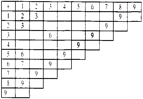 Мал. 15 Нехай нам треба обчислити приклад 3 + 5. Знайдемо число 3 у стовпці, а число 5 у рядку. Яке число ви бачите на перетині рядка і стовпця з цими числами? (Учні вказівним пальцем правої руки ведуть вниз від числа 5, а вказівним пальцем лівої руки — вправо від числа 3. Пальці “зустрілись” у клітинці з числом 8.) То який приклад ми обчислили? (З + 5 = 8.) Отже, числа стовпця означають перший доданок, а числа рядка — другий доданок. Цей приклад можна обчислити й по-іншому: число З взяти у рядку, а число 5 — у стовпці. Учні переконуються, що знову одержується число 8. Що тепер означає рядок? (Перший доданок.) Чому так вийшло? (Бо від перестановки доданків сума не змінюється). 2. Первинне закріплення нового матеріалу. Учитель записує на дошці приклад 9 – 4 і пояснює, як знайти відповідь за таблицею: — З усіх цифр 9 треба вибрати ту, що стоїть навпроти цифри 4, яка розміщена ліворуч. Тоді вгорі над числом 9 читаємо результат прикладу: 5. — Учні виконують за таблицею кілька прикладів на віднімання (використовується гра “Рахунок ”. Опис гри див. опис програм, 2.1). Методика використання гри: 1. Організація. Коротке роз’яснення правил гри. 2. Поділ учнів на команди (можна використати диференційований підхід). 3. Самостійна робота учнів: · слабкі учні виконують завдання гри “Хатинка” (звичайний розв’язок прикладів); · учні з середнім рівнем навчальних досягнень розв’язують аналогічні приклади з використанням часових обмежень (гра “Пірамідка”); · сильні учні самостійно складають приклади на додавання і віднімання в межах 10, в рамках комп’ютерної гри “Коралі”. ФізкультхвилинкаII. Розвиток математичних знань 1.3.1. Гра “Послідовності ” (Опис гри див. опис програм, 2.1): · навчальний етап (учитель пояснює основні елементи роботи в програмі); · ігровий етап (власне робота учнів із програмою); · заключний етап (підведення підсумків, аналіз гри). Фізкультхвилинка (особлива увага на вправи для зняття навантаження на очі).1.3.2. Фронтальна робота над задачами. • У десятилітрове відро налили 7 л води. Скільки літрів води треба долити до повного відра? • У літрову банку налили 2 склянки соку. Скільки ще склянок соку поміститься в цій банці? • У які дві каструлі можна перелити молоко з бідона? 3. Гра “Водолій” ( Опис гри див. опис програм, 2.1). Методика використання гри “Водолій” : 1. Коротко пригадати одиницю вимірювання об’єму – літр; 2. Продемонструвати учням виконання завдань у програмі; 3. Самостійна робота учнів. III. Підсумок уроку. Гра “Допоможи гномику заповнити таблицю Піфагора”. Учні по черзі виходять до комп’ютера і, з допомогою вчителя, заповнюють порожні клітинки таблиці, накресленої раніше. При цьому вони показують, як склали відповідні приклади.