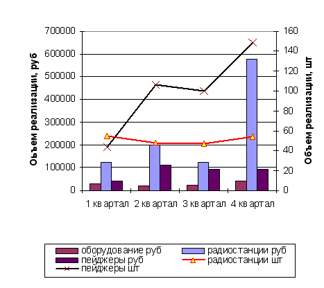 Наиболее продуктивным в 1998 году был декабрь месяц: товарооборот составил 322061,01 рубль (или 19,46% от годового товарооборота). Резкий спад реализации в августе и сентябре объясняется августовским экономическим кризисом, когда резко возрос курс доллара. Цены на реализуемое оборудование выросли, так как оно покупается в долларах, поэтому в сентябре не продано не одной радиостанции. Включение пейджеров в ассортимент реализуемых товаров начался с февраля месяца, отсюда и отсутствие суммы реализации пейджеров в январе 1998 года.