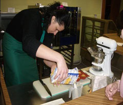 Происходит замес яичных желтков и белков с сахарным песком до образования однородной массы и до увеличения объема в 2,5-3 раза в кухонном комбайне. Затем вводится мука пшеничная, крахмал и эссенция и тесто перемешивают до однородной массы.