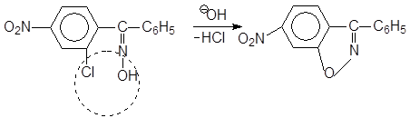 например: 2-хлор-5-нитробензофеноксимов при действии щелочи легко отщепляет HCI, образуя изоксазольный цикл