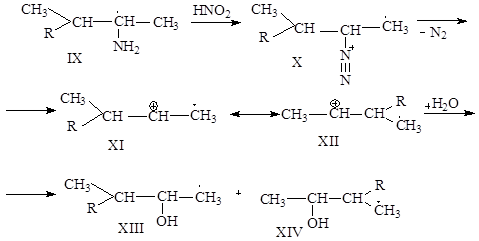 (Здесь даны только исходный бромгидрин и конечный пинаколин; механизм, очевидно, тот же.) Еще одна аналогичная перегруппировка - «окислительное дезаминирование» Мак-Кензи: