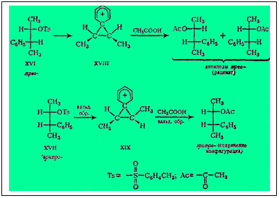 При ацетолизе трео-стереоизомер XVI полностью рацемизуется, а эритро-стереоизомер XVII превращается в ацетат, сохраняющий в полной мере оптическую активность. Крам постулирует образование в качестве промежуточных форм в течение перегруппировки структур XVIII и XIX, включающих фенониевый катион, привязанный симметрично к обоим углеродным атомам - стартовому и финишному. Углеродный атом ароматического кольца, связанный первоначально со стартовым атомом С, в трехчленной промежуточной форме стал тетраэдрическим. Значит, плоскость бензольного кольца стала перпендикулярной к плоскости чертежа. Положительный заряд финишного атома С теперь рассредоточен в триаде углеродных атомов трехчлена, а следовательно, и по всем атомам бензольного цикла, что, по Краму, снижает энергетический уровень этой переходной формы и тем самым ускоряет реакцию. Разрыв под действием уксусной кислоты гипотетического трехчленного катиона в случае трео-изомера XVI, имеющего плоскость симметрии, должен вести к рацемату, так как разрыв равновероятен слева и справа (или, иначе, две симметричные молекулы при реакции не могут дать одну оптически активную форму, но лишь рацемат). Напротив, в случае эритро-изомера XVII ацетолиз несимметричной трехчленной структуры, с какой бы стороны ни шла атака уксусной кислоты, приводит к исходной конфигурации. Следует обратить внимание на то, что и замыкание в трехчленный Никл с удалением тозилат-аниона, и разрыв трехчленного цикла с возвращением фенониевого катиона в бензоидную форму происходит с вальденовским обращением. В. Хюккель, оспаривающий трактовку Крама и самое существование фенониевого катиона, и трехчленного цикла, указывает, что стереоспецифичность рассматриваемой реакции можно объяснить просто переменой местами фенильной группы с тозилатной (или с заменяющей ее ацетатной) с двумя вальденовскими обращениями: