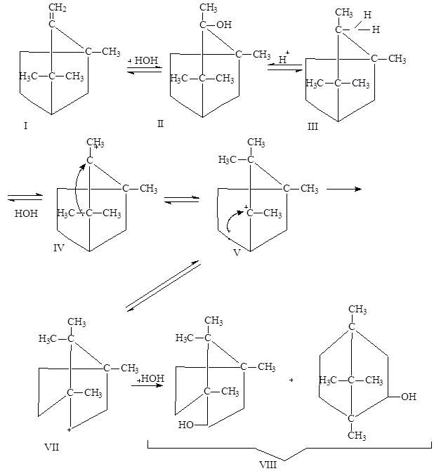 Механизм перегруппировки Наметкина заключается в изомеризации углеродного скелета по типу ретропинаколиновой или, при обратном процессе, - пинаколиновой перегруппировки. Рассмотрим механизм: 1.К α-метилкамфену (I) идет присоединение воды по двойной связи в соответствии с правилом Марковникова (II). 2.Дальнейшая протонизация дает оксониевый ион (III). Как известно, вода – это хорошо уходящая группа. Вследствие этого, соединение (III) превращается в открытый карбкатион (IV). 3.Затем собственно здесь начинается перегруппировка: атака нуклеофила (пары электронов) по положительному реакционному центру. То есть миграция группы, имеющей избыток электронов (÷СН3) к атому, несущему положительный заряд (карбкатион), стабилизация карбкатиона, одновременный уход ÷СН3 группы и атака его по карбкатиону обуславливает тот факт, что данная перегруппировка является внутримолекулярной (интрамолекулярной). 4. В месте ухода÷СН3 группы появляется новый реакционный центр, который может сразу перейти в конечный продукт (4-метилиззоборнеол), либо сразу при взаимодействии с водой, либо претерпевающий перегруппировку (VII). Таким образом, перегруппировка Наметкина является нуклеофильной, внутримолекулярной перегруппировкой. 3.Зависимость продуктов перегруппировки от различных факторов. Состав и структура продуктов камфеновой перегруппировки определяется относительной скоростью ряда параллельных изомеризации. Например, для производных борнеола (VII) возможны: 1,2-гидридный сдвиг (а), 142-миграция группы СН3 (б), перемещение мостика (в) и сужение алицикла (г). Однако в основном реализуется путь (г), поскольку в случае (а) образуется менее стабильный вторичный карбкатион (IX), путь (б) запрещен Бредта правилом, по пути (в) получается термодинамически невыгодный четырехчленный цикл:
