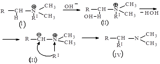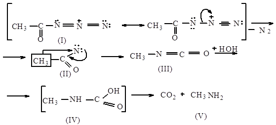 1.На первой стадии при действии на соединение (I) иона гидроксила, происходит образование хорошей уходящей группы- воды. 2.Вследствии того, что α- водородный атом в соединении (I) является подвижным, происходит отрыв воды и образование карбаниона(III).Так как на атоме азота имеется недостаток электронной плотности , он оттягивает на себя пар электронов, тем самым создавая недостаток электронной плотности на радикале, вследствии чего он может атаковать карбанион. 3.Далее происходит одновременное разрыхление связи между радикалом и атомом азота и образование между радикалом и карбанионом, следствием чего является образование конечного продукта- амина (IV) 3.Влияние заместителей на протекание перегруппировки.