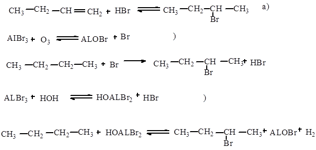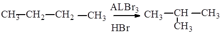 Данная перегруппировка является нуклеофильной, интрамолекулярной, происходит с изомеризацией в алифатическом ряду с миграцией от атома углерода к другому атому углерода. 2.Механизм перегруппировки. Изомеризация н- бутана в изобутан происходит только в присутствии следов олефина, кислорода или воды. Эти примеси участвуют в первоначальном образовании небольших количеств вторичного н- бромистого бутила по одной из схем: