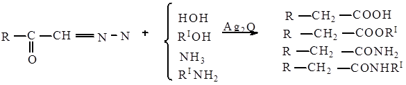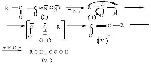 1. При отщеплении от диазометилкетона (1) азота под влиянием катализатора или температуры образуется промежуточный бирадикал(2)- карбен. 2. Карбен (2) претерпевает перегруппировку: так как кислород более электроотрицателен чем углерод, то он оттягивает на себя электронную плотность, мезомерно передавая это воздействие на радикал, вследствие чего на радикале возникает недостаток электронной плотности. 3.В связи с этим он может отакавать электронодифицитный атом углерода. Так как образующееся соединение (3) неустойчиво, оно переходит в кетен (4). 4.Образующийся кетен очень реакционноспособен, поэтому легко дает производные кислот.(5). 3.Побочные реакции. Бирадикал-карбен (2) может претерпевать и иную перегруппировку в зависимости от того какими реагентами действовать на диазометилкетон. Так при действии на диазометилкетон водой и муравьиной кислотой в отсутствии катализатора в качестве побочного продукта образуются оксиметилкетоны: