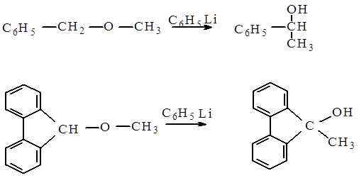Перегруппировка Виттига является электрофильной,внутримолекулярной, стереоспецифической, протекает без изомеризации, с миграцией от атома углерола к другому атому углерода в насыщенных системах. 2.Механиз перегруппировки. 1.Перегруппировка Виттига происходит в результате обработки эфиров фениллитием. Первая стадия процесса состоит в замещении a - водородного атома бензильной или другой реакционноспособной алкильной группы на литий. (см. Схему перегруппировки стадия I) 2.Виттиг предположил, что в металлическом производном либо уже имеется, либо легко образуется карбанион, к отрицательному центру, которого перемещается в виде электрофильного остатка другая алкильная группа, имеющая только шесть электронов в оболочке с главным квантовым числом 2. (см. Схему перегруппировки стадия II)