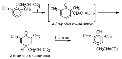 2,4-Циклогексадиенон является интермедиатом перегруппировки аллилариловых эфиров. Такой интермедиат может быть выделен при перегруппировке аллилового эфира 2,6-диметилфенола, когда аллильная группа мигрирует в пара-положение, поскольку енолизация кетона в фенол в этом случае не может происходить из орто-положения. Конечным результатом двух последовательных миграций аллильной группы является сохранение структуры мигрирующей группы.