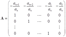 , имеет собственные значения равные корням полинома. Напомним, что собственными значениями матрицы называются такие числа , для которых выполняется равенство