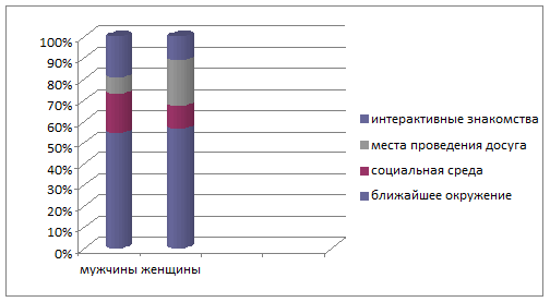 На вопрос о предполагаемом месте встречи будущего супруга (супруги) Мужчины предпочитают ближайшее окружение 58,2, интерактивные знакомства 20,4%. Женщины высказали предпочтение ближайшему окружению - 53,3%, места проведения досуга - 20,1% Таблица 2.