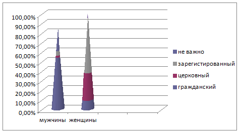 По результатам анализа ответов на 4 вопрос мужчины предпочли гражданский брак - 54,6%, не важно ответили - 24,3%. Женщины предпочитают брак зарегистрированный - 56,8%, церковный - 28,2%.