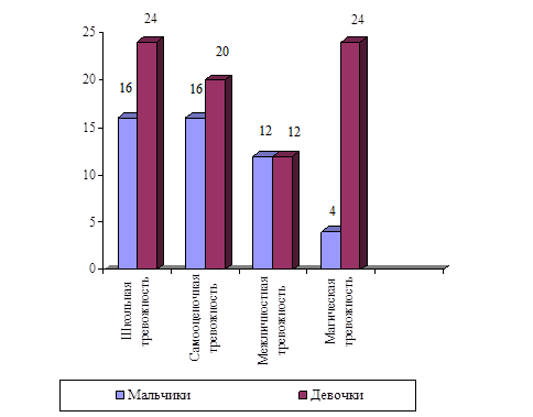 Проанализировав полученные результаты, нами было выявлено количество детей, обладающих следующими видами тревожности: IОбщая тревожность в школе – 10 мальчиков (40%) и 10 девочек (40%) IIПереживание социального стресса – 4 мальчика (16%) и 2 девочки (8%) IIIФрустрация потребностей в достижении успеха – 0 мальчиков и 3 девочки (12%) IVСтрах самовыражения – 5 мальчиков (20%) и 2 девочки (8%) VСтрах ситуации проверки знаний – 3 мальчика (12%) и 6 девочек (24%) VIСтрах несоответствовать ожиданиям окружающих – 3 мальчика (12%) и 7 девочек (28%) VIIНизкая физиологическая сопротивляемость стрессу – 4 мальчика (16%) и 6 девочек (24%) VIIIПроблемы и страхи в отношениях с учителями – 3 мальчика (12%) и 8 девочек (32%)