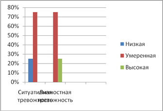 Из таблицы видно, что у девочек низкий уровень ситуативной и личностной тревожности отсутствует; умеренный уровень ситуативной тревожности составляет 77,8%; высокий уровень ситуативной тревожности составляет 22,2%. Умеренный уровень личностной тревожности составляет 33,3%; высокий уровень личностной тревожности составляет 66,7%. У мальчиков низкий уровень ситуативной тревожности составляет 25 %; умеренный уровень ситуативной тревожности составляет 75%; высокий уровень ситуативной тревожности отсутствует. Низкий уровень личностной тревожности отсутствует; умеренный уровень личностной тревожности составляет 75%; высокий уровень личностной тревожности составляет 25%. Высокотревожные подростки вспыльчивы, раздражительны и находятся в постоянной готовности к конфликту и готовности к защите, даже если в этом объективно нет надобности. Для них, как правило, характерна неадекватная реакция на замечания, советы и просьбы. Особенно велика возможность нервных срывов, аффективных реакций в ситуациях, где речь идет об их компетенции в тех или иных вопросах, их престиже, самооценке, их отношении. Боязнь неудачи - характерная черта высокотревожных подростков. Для низкотревожных подростков характерно ярко выраженное спокойствие. Они не всегда склонны воспринимать угрозу своему престижу, самооценке в самом широком диапазоне ситуаций, даже когда она реально существует. Возникновение состояния тревоги у них может наблюдаться лишь в особо важных и личностно значимых ситуациях (экзамен, стрессовые ситуации, реальная угроза семейному положению и др.). В личностном плане такие люди спокойны , считают, что лично у них нет поводов и причин волноваться за свою жизнь, репутацию, поведение и деятельность. Вероятность возникновения конфликтов, срывов, аффективных вспышек крайне мала. Таким образом, результат проведённого тестирования в области ситуативной и личностной тревожности показал, что высокий уровень тревожности в большей степени проявляется у девочек, чем у мальчиков. Более подробно результаты представлены на рисунке 1 и 2.