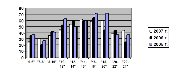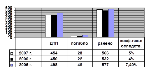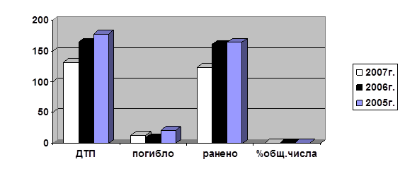 Наиболее информативны электрофизиологические методы диагностики состояния водителя. Уже в настоящее время эти методы позволяют искать пути оптимизации всего комплекса «водитель – автомобиль – дорога - среда» через изучение работы его главного звена - человека в реальных производственных условиях. 1.6 Анализ аварийности по городу Йошкар-Ола за 2007, 2006, 2005 года Важной основой всей работы по организации и обеспечению безопасности дорожного движения является анализ данных о дорожно-транспортных происшествиях. К дорожно-транспортным происшествиям относятся события, возникшие в процессе движения по дороге транспортного средства или с его участием, при котором погибли или ранены люди, повреждены транспортные средства, груз, сооружения. Учету подлежат все дорожно-транспортные происшествия, независимо от места их совершения, если это событие соответствует приведенному определению. К числу погибших относят лиц, скончавшихся на месте дорожно-транспортного происшествия или в течении 7 суток с момента происшествия. В число раненых включают людей, которые получили телесные повреждения, вызвавшие потерю трудоспособности или необходимость госпитализации на срок не менее одного дня, либо назначение амбулаторного лечения после оказания первой медицинской помощи. Однако в государственную статистическую отчетность включают лишь те ДТП, при которых были погибшие или раненые. Сведения о других происшествиях в государственную отчетность не включают. Их обобщают и анализируют на уровне регионов. Учет ДТП ведут: органы внутренних дел; предприятия и организации, министерства и ведомства; государственные органы управления автомобильными дорогами, владельцы ведомственных и частных дорог. Ведется также учет пострадавших при ДТП в медицинских учреждениях. Учет ДТП, проводимый в органах внутренних дел, является наиболее полным. Принято деление всех ДТП на следующие виды: столкновение транспортных средств, опрокидывание, наезд на стоящее транспортное средство, наезд на препятствие, наезд на пешехода, наезд на велосипедиста, наезд на гужевой транспорт, падение пассажира, иной вид ДТП. На обслуживаемой, ОБ ДПС ГИБДД, территории за 12 месяцев 2007г. зарегистрировано 454 ДТП, в которых 28 человек погибло, и 566 человек получил ранения. Коэффициент тяжести последствий составил 5%.