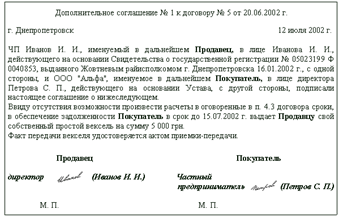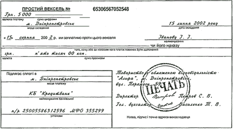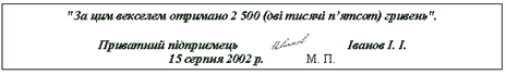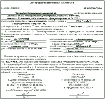 Образец заполнения простого векселя Согласно ст. 75 Унифицированного закона простой вексель должен содержать следующие реквизиты: 1. Название «Простой вексель», включенное в текст документа и написанное на том языке, на котором этот документ составлен. 2. Безусловное предложение уплатить определенную сумму денег. Сумма, подлежащая уплате по векселю, в стандартном вексельном бланке указывается цифрами и прописью. При этом, в соответствии со ст. 6 Унифицированного закона, в случаях если имеются расхождения между данными обозначениями, то по векселю подлежит уплате сумма, указанная прописью. 3. Указание срока платежа. Срок платежа – это момент, в который векселедержатель имеет право потребовать оплатить вексель. Чтобы правильно отразить срок платежа по векселю, необходимо знать требования ст. 33 Унифицированного закона, определяющей возможные способы указания срока платежа. В соответствии с этой статьей вексель может быть выдан с одним из следующих сроков платежа: – по предъявлению – вексель должен быть оплачен в любой момент по требованию векселедержателя; – в определенный срок от предъявления – в данном случае вексель может быть предъявлен векселедержателем к оплате в любой момент, а его оплата производится через оговоренное количество дней; – в определенный срок от даты составления – в векселе указывается, через какой срок он будет предъявлен к оплате; – на определенную дату – в векселе отражается конкретная дата оплаты. В соответствии со ст. 76 Унифицированного закона, простой вексель, срок платежа в котором не указан, считается подлежащим оплате по предъявлению. Векселя, которые содержат другие сроки платежа или предусматривают оплату частями, являются недействительными. 4. Указание места, в котором должен быть осуществлен платеж. Статья 76 Унифицированного закона определяет, что если место платежа в векселе не отражено, то им будет считаться место выдачи векселя. 5. Наименование лица, которому или по приказу которого осуществляется платеж. Во избежание возможных проблем при взыскании задолженности по векселям частным предпринимателям необходимо обратить внимание на то, что в ст. 5 Закона № 2374 отмечается, что наименование векселедателя, других обязанных по векселю лиц, заполняются на том языке, на котором определено официальное наименование в их учредительных документах. 6. Дата и место составления векселя. 7. Подпись лица, выдавшего вексель (векселедателя). Вексель, в котором отсутствует хотя бы один из вышеперечисленных обязательных реквизитов, считается недействительным. IV. Акт предъявления векселя к платежу ЧП Ивановым И. И. в адрес ООО «Альфа». Образец составления Акта предъявления векселя к платежу В соответствии со ст. 38 Унифицированного закона векселедержатель переводного (простого) векселя со сроком платежа в определенный день от даты составления (или предъявления) обязан предъявить вексель к платежу в день, в который он подлежит оплате, или в один из двух следующих рабочих дней. V. Вексельная расписка. Возврат оригинала векселя векселедателю. После получения оплаты по векселю ЧП Иванов И. И. передает оригинал простого векселя ООО «Альфа» с отметкой о получении платежа, осуществленной им на обратной стороне векселя. Обязательное осуществление такой отметки на векселе либо предоставление векселедателю