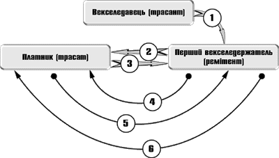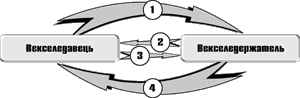 1 - видача векселя 2 - пред'явлення векселя до оплати 3 - погашення векселя (оплата) 4 - вручення погашеного векселя з розпискою про отримання платежу Переказний вексель (тратта) - це письмовий наказ векселедавця платнику (трасату) про сплату векселедержателю певної суми грошей у визначеному мiсцi у визначений час. Причому отримувачем коштів може виступати як перший векселедержатель (ремiтент), так i кожний з наступних векселедержателів (iндосат). Схема застосування переказного векселя показана на мал. 2 (нижче). Векселедавець виписує переказний вексель векселедержателю; за цим векселем платник повинен сплатити iндосату визначену суму грошей. Пiсля цього векселедержатель здiйснює пред'явлення векселя до акцепту (презентацiю).Платник переказного векселя (трасат) стає боржником по векселю тільки після того, як акцептує вексель. Акцепт – засвідчена підписом трасата або іншої особи (посередника в акцепті) згода оплатити переказний вексельну тому вигляді, в якому він пред’явлений до платежу. Платник може відмовитись від акцепту. В цьому випадку ремітент вимагає від трасата оплати виданого векселя. Якщо ж платник здійснив підтвердження акцепту, то вексель вважається акцептованим. В зумовлений час вексель пред'являється до оплати. Якщо трасат не здійснює відмови від платежу по векселю (можливе й таке), проводиться погашення векселя (оплата) з подальшим врученням погашеного векселя з розпискою про отримання платежу. Векселі загалом застосовуються у випадках: коли необхідно провести відстрочення платежу або коли є потреба оперативно провести фінансову операцію. У торговельних операціях часто переказний вексель виписує продавець - клієнт певного банку, де він брав кредит для здійснення операції (трасант) на покупця-контрагента (трасат) на користь банку-кредитора (ремітент). Будь-який переказний вексель може бути переданий шляхом індосаменту, тобто передавального напису на векселі. Індосамент має бути простим і нічим не обумовленим. Індосамент має бути написаний на переказному векселі або на приєднаному до нього аркуші та підписаний особою, що володіє векселем на підставі індосаменту (індосантом). Особа, в якої знаходиться переказний вексель, вважається законним векселедержателем. Кожний індосант (особа, що володіє векселем на підставі індосаменту) може обумовити, що вексель повинен бути пред'явлений до акцепту з призначенням строку або без його призначення, якщо тільки вексель не оголошений векселедавцем як такий, що не підлягає акцепту. Акцепт має бути простим і нічим не обумовленим. Платник через акцепт бере на себе зобов'язання оплатити переказний вексель у визначений строк. Платіж за переказним векселем може бути забезпечений повністю або в частині вексельної суми через аваль . Аваль - це вексельне поручительство, яке гарантує оплату векселя . Аваль дається на переказному векселі або на додатковому аркуші, проте він може бути даний і на окремому аркуші з зазначенням місця його видачі. Він виражається словами "вважати за аваль" або будь-якою іншою рівнозначною формулою і підписується тим, хто дає аваль. Для авалю достатньо лише підпису, поставленого авалістом на лицьовому боці переказного векселя, якщо тільки цей підпис не поставлений платником або векселедавцем. В авалі повинно бути вказано, за кого він виданий. У разі відсу