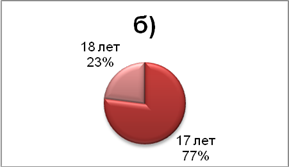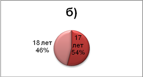 Рисунок 4 - Возрастная структура потенциальных абитуриентов с. Объячево: а) Девушки; б) Юноши. На диаграммах видно, что большая часть опрошенных абитуриентов в возрасте 17 лет. 2.2