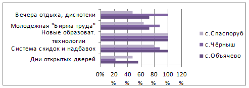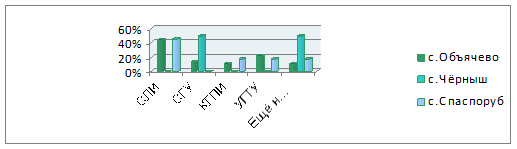 Исходя из данных таблицы, можно судить о том, что Сыктывкарский Лесной институт по многим показателям занимает лидирующее положение. Так юноши объячевской СОШ считают, что в СЛИ обучается больше студентов, тут же самые лучшие учебные корпуса, самые востребованные специальности, более профессиональные преподаватели, самый большой конкурс при поступлении и после его окончания выпускники легче находят работу. Девушки же считают, что больше студентов обучается в СГУ и там самый большой конкурс при поступлении. И одновременно они согласны с юношами, что в СЛИ самые востребованные специальности и после его окончания выпускники легче находят работу. Таблица 2 - Сравнение вузов г. Сыктывкара, ответы потенциальных абитуриентов с. Чёрныш