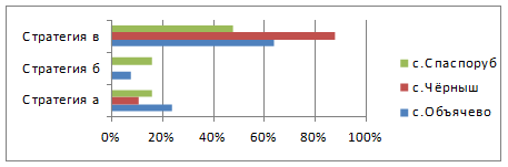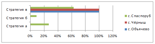 б) Рисунок 12 - Какой стратегии Вы придерживайтесь: а) девушки, б) юноши. На диаграмме 12 а) показан выбор стратегии, которой придерживаются девушки. И в общем можно судить о том, что большинство девушек делают свой выбор в пользу Стратегии в - Сначала определились с конкретной специальностью, а затем выбрали вуз, который осуществляет по ней подготовку. Но от 15 до 20% девушек объячевской и спаспорубской СОШ, соответственно, выбрали Стратегию б - сначала выбрали вуз, в который будут поступать, а потом конкретную специальность. Стратегии а - сначала определились с направлением подготовки (экономическое, инженерное, педагогическое и т.д.), затем выбрали вуз, который осуществляет подготовку по данному направлению, а потом конкретную специальность (экономист, бухгалтер, финансист и т.д.) в среднем придерживаются 20% всех опрошенных девушек. На диаграмме 12 б) мы можем наблюдать, в пользу какой стратегии сделали выбор юноши. И большая часть юношей выбрали стратегию в), но кроме того, абитуриенты спаспорубской СОШ 15% отдают предпочтение стратегии б), а так же 25% стратегии а). Часть 2. 1.