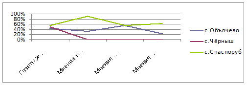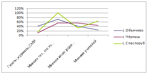 Б) Рисунок 18 - Наиболее важные факторы, которые повлияли на формирование мнения о СЛИ: а) Девушки, б) Юноши. Исходя из данных диаграмм, можно увидеть, что на формирование мнения о СЛИ наибольшее влияние оказывают мнения тех, кто там учиться, так ответили от 50 до 100% опрошенных девушек. Предпочтение газетам, журналам и телевидению отдали лишь 15 - 40% опрошенных девушек. Немало важным фактором является то, что потенциальные абитуриентки от 30 до 55% прислушиваются к мнению своих родителей и к мнению учителей. А вот мнения юношей очень сильно расходятся. Для 90% потенциальных абитуриентов из спаспорубской СОШ и всего лишь для 35% юношей из объячевской СОШ наибольшее влияние оказывают мнения, кто там учиться. А вот для опрошенных юношей из чернышской школы вообще неважно мнения, тех, кто там учится, мнения своих родителей и мнения учителей. Но всё же для 55% юношей из спаспорубской и объячевской СОШ важным фактором, который влияет на формирование мнения о СЛИ является мнение их родителей. А вот мнения учителей могут повлиять лишь на 20% юношей из объячевской СОШ, и на 65% потенциальных абитуриентов из спаспорубской СОШ. В среднем же, можно сказать, что для 45 - 55% всех опрошенных абитуриентов газеты, журналы и телевидение могут оказать наибольшее влияние на формирование мнения о СЛИ. 7.