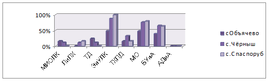 Б) Рисунок 19 - Наиболее привлекательные специальности в СЛИ: а) Девушки, б) Юноши. Наибольшей популярностью в СЛИ среди опрошенных девушек пользуются следующие специальности: ЭиУЛК - 45% - Объячевская СОШ; 85% - Чернышская СОШ; 100% - Спаспорубская СОШ; МО - 45% Объячевская СОШ; 75% Чернышская СОШ; 80% Спаспорубская СОШ; БУиА - 40% Объячевская СОШ; 65% Чернышская СОШ; 63% Спаспорубская СОШ. Наиболее привлекательные специальности в СЛИ для юношей следующие: МИОЛК - 55% Объячевская СОШ; 100% Спаспорубская СОШ; ЛиЛХ - 45% Объячевская СОШ; 50% Чернышская СОШ; 100% Спаспорубская СОШ; ТД - 55% Объячевская СОШ; 100% Чернышская СОШ; 70% Спаспорубская СОШ; И для 50% опрошенных юношей Объячевской и Чёрнышской СОШ специальности - ЭиУЛК, ТПХД и МО тоже являются привлекательными. 8