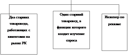 Рисунок 2 - Структура отдела маркетинга Функции, выполнение которых входит в обязанности работников отдела, оговорены в должностных инструкциях соответственно занимаемым должностям. В отделе действуют четыре должностные инструкции: -начальника отдела; -заместителя начальника; -товароведа; -инженера по рекламе. Данные должностные инструкции были составлены несколько лет назад. В основном права, обязанности и ответственность работников, оговариваемые в действующих инструкциях, соответствуют действительности и выполняются. По существующему на предприятии «Положению об отделе маркетинга» на данный отдел возложено выполнение следующих функций и задач: 1) задачи - координация работы производственных и коммерческих служб с целью удовлетворения запросов потребителей и получения прибыли; - выработка стратегии и тактики предприятия на потребительском рынке с помощью маркетинговых программ. 2) функции - обеспечение своевременного заключения договоров, квартальных графиков поставки продукции; - организация сбыта продукции в соответствии с заключенными договорами; - участие в разработке ценовой политики предприятия; - организация работы по рекламе выпускаемых услуг, изучению рынка сбыта; - расширение внешнеэкономических связей. В составе аналитической функции маркетинга, данным отделом проводятся следующие мероприятия: 1) Поскольку изучение рынка не представляется отделу маркетинга необходимым условием успешного проведения целенаправленной маркетинговой политики, данное мероприятие не осуществляется, что, несомненно, является недостатком работы отдела. Ведь, зная условия и тенденции развития экономики, политики, законодательства, а также стиля жизни и демографические изменения, можно предвидеть спрос на ту или иную услуга изделий. В связи с этим, изучение спроса покупателей, проводимое предприятием в АО «Алма-ТВ», не достигает нужного эффекта, который присутствовал бы при одновременном исследовании тенденций развития рынка и изучения покупательских предпочтений. 2) Услуги предприятия рассчитаны на массового покупателя со средним уровнем доходов, поэтому при их реализации АО «Алма-ТВ» старается по возможности учесть потребности всех возрастных групп населения и при этом сохранить доступные цены. Специфика реализуемых АО «Алма-ТВ» услуг такова, что успех или неуспех каждой конкретной услуги у покупателей влияет на результаты работы целого предприятия. Так как АО «Алма-ТВ» очень крупное предприятие и имеет большие мощности, то невыгодно реализовывать услуги в небольших количествах, а результатом выпуска неудачных услуг может быть недополучение прибыли. Поэтому очень важным является постоянное изучение спроса потребителей на каждую новую услугу, а также сбор информации о результатах реализации уже выпущенных услуг. При этом проводятся следующие мероприятия: 1) Изучение спроса на новую услугу проводится в пункте маркетинга АО «Алма-ТВ». Для этого новую услугу, выставляют на обзор посетителям АО «Алма-ТВ». Работники отдела маркетинга проводят опрос представителей различных возрастных групп. 2) Систематически работник отдела маркетинга, в функции которого входит изучение спроса, посещает крупные торговые организации, которые продают изделия фабрики, с целью сбора информации о том, как реализуется данная усл